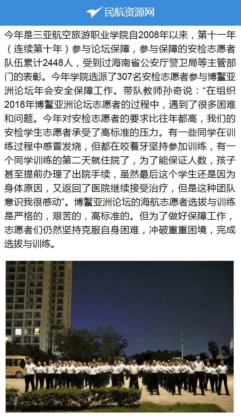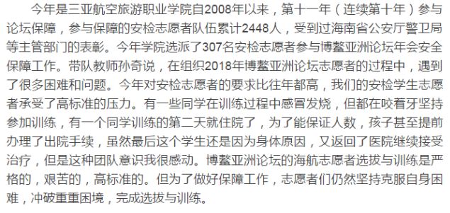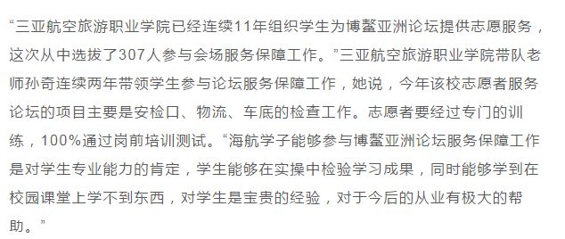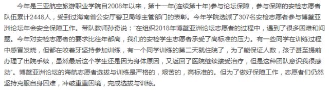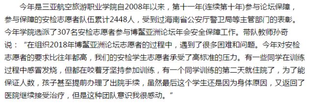 作为海南省公安厅正式授牌的博鳌亚洲论坛安检人员培训基地,在这11年间,开元集团网站共派出了安检专业2755名学生参与论坛保障:他们全力以赴,高标准要求,高标准执行,圆满完成了海南省公安厅交办的安保任务。作为世界五百强企业海航集团创办的高校,这是学院秉持海航精神,始终将社会责任作为自身战略发展目标之一,坚定践行自身社会责任所交出的一份“答卷”。