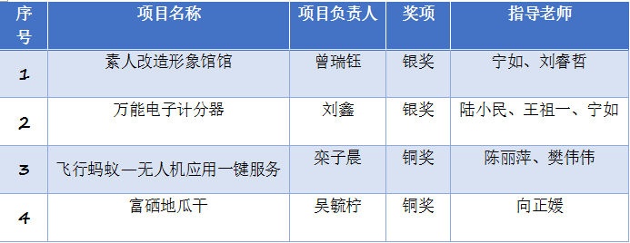经过校赛及省级初赛选拔,我校共有4个项目入围本届大赛决赛。为了更好地参与大赛,校长助理陈明锐、教务处处长樊伟伟、实践教学中心和创新创业教研组在赛前多次对入选项目进行赛前彩排,精心打磨。最终在决赛中,经过项目展示和路演答辩等环节的激烈角逐,我校4个项目克服重重困难,发挥敢打敢拼、争先创优的精神,斩获2银2铜,创我校有史以来最好成绩!与此同时,《素人改造形象馆》和《万能电子计分器》还成功入选海南省“互联网+”大学生创新创业大赛训练营,参加为期一天的集训活动,接受大赛专家评委的一对一指导。