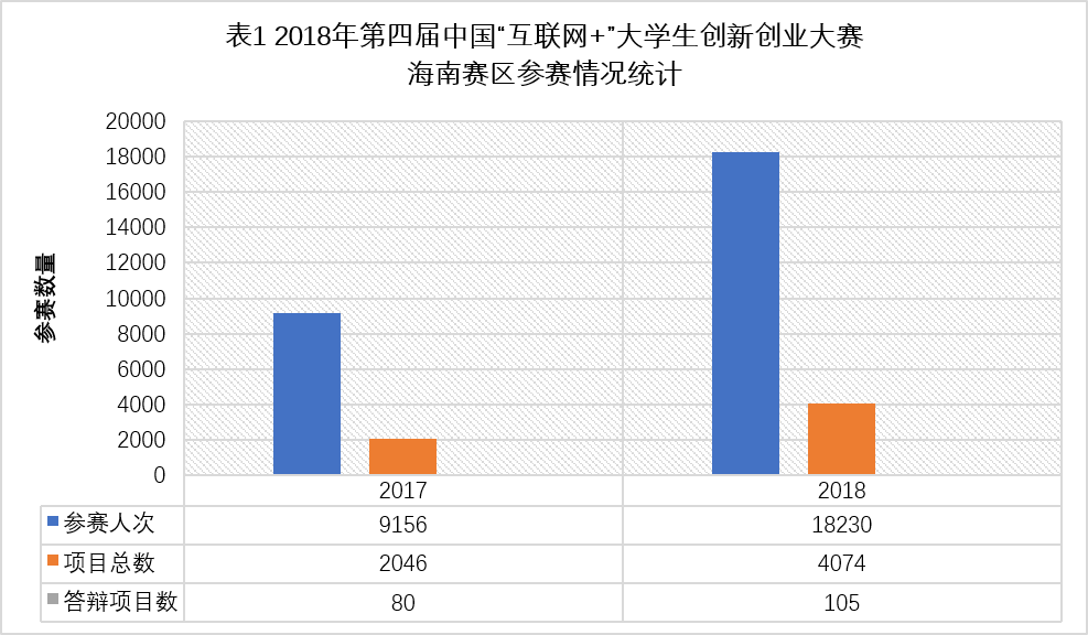 6月12-14日,由海南省教育厅、海南省工信厅主办,海南大学承办的第四届中国“互联网+”大学生创新创业大赛海南赛区竞赛在海口举行。本次大赛全省共有19所本科及高职院校参加,参数人次达18230人次,参数项目共计4074项,参赛人数和项目总数都较往年翻了一番,但能够进入决赛获得路演答辩机会的项目仅有105项,竞争极为激烈。