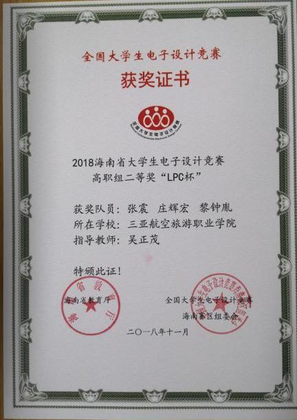 比赛于2018年10月17日上午8:00至20日晚上20:00,在我省各参赛学校有序开展,共有来自省内10所高校的209支参赛队627名学生参加竞赛。我校共组织6支代表队18名学生参加比赛,参赛学生3人一组在4天的时间里根据所选择的题目分工合作,共同完成方案设计、实物制作、论文撰写等工作,最终将设计作品提交评审。按照大赛组委会要求,我校从6支参赛队伍中推送2支优秀队进入最后的综合测评。2018 年10月27日,在海南大学信息科学技术学院经专家评委对各高校推荐的优秀作品进行复测,最终,我校2支优秀参赛队分别获得高职组省级一等奖和二等奖,指导教师张旭(电子)获得优秀指导教师奖。大赛组委会还于2018年12月26日在海南省软件职业技术学院举行了颁奖典礼,至此,本年度的比赛圆满结束。