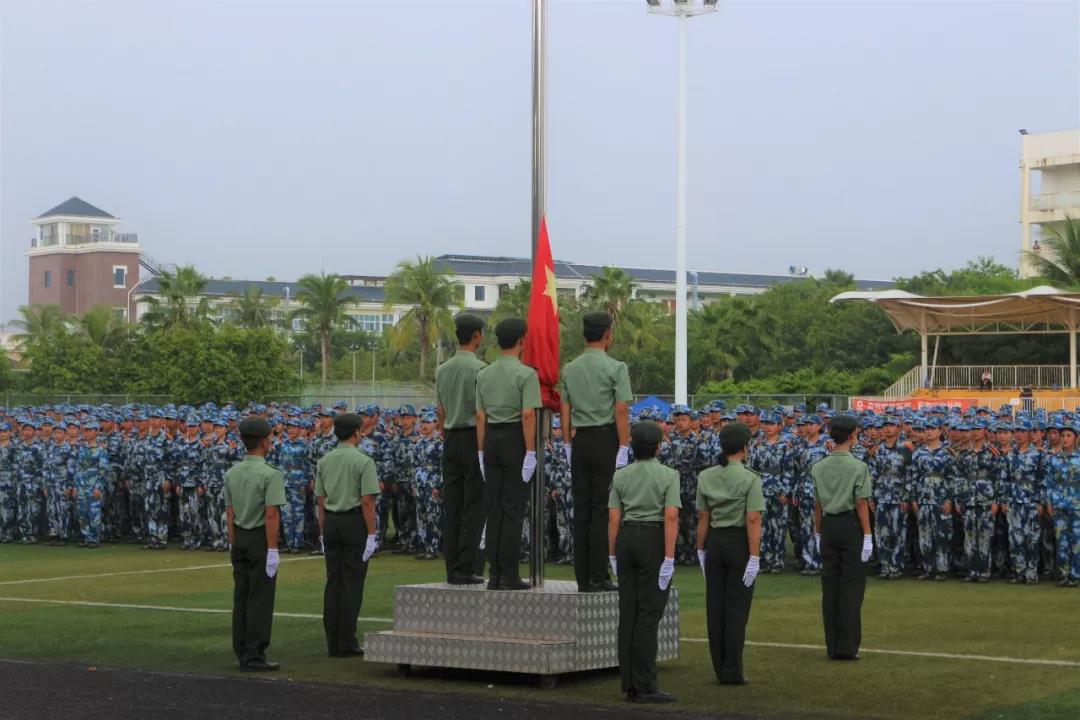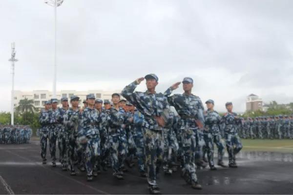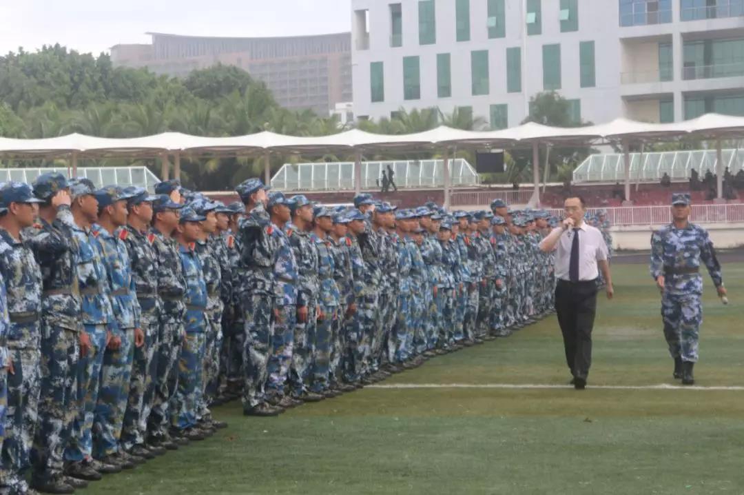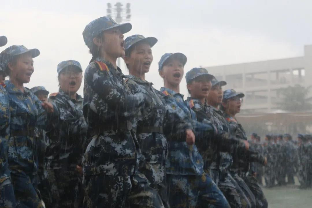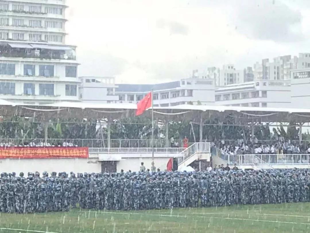 而此时,我们亲爱的同学们和他们的领队教官一起在风雨中“咬定青山不放松,立根原在破岩中;千磨万击还坚劲,任尔东西南北风”!雨水并没有浇灭同学们的热情,他们精神饱满,小脸坚毅,当学校学生工作处处长孙伟志要求全体2019级新生组成的参阅列阵进看台避雨时,他们大喊:我们不走!我们还能坚持!不禁想起这些天来同学们在三亚酷热的天气中进行的训练:操场上一个个稚嫩的身影,顶着热带的烈日,从歪歪扭扭学站军姿到如今如挺拔的小松树一般“我自岿然不动”;从桀骜不驯到严守纪律、百折不挠;一张张小脸从白皙变得黝黑。每日湿了军帽,湿了衣襟,分不清是汗水还是泪水,还会向辅导员、班助甚至父母诉诉苦、道道累。可此时此刻无不透露出“壮志凌云冲霄汉—我们长大了!”的崭新精神面貌。