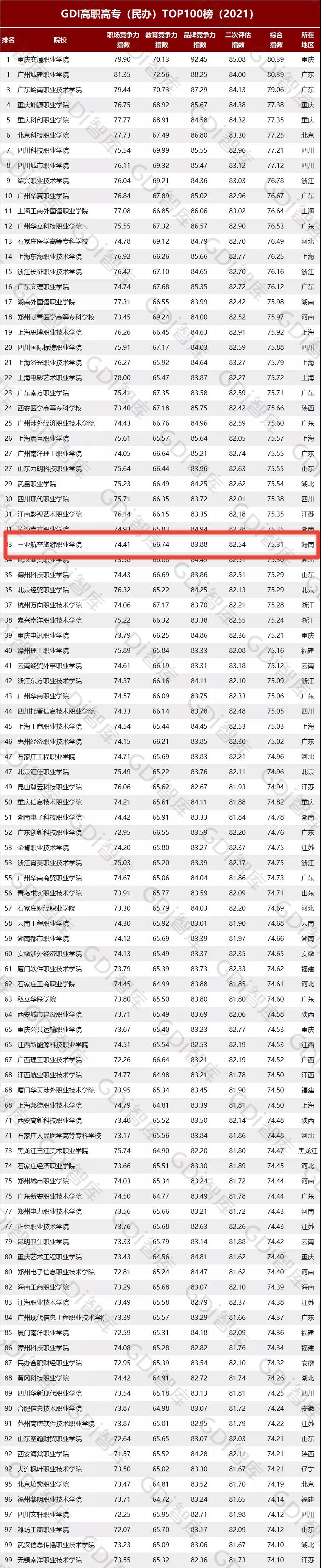 2021年4月21日,最新GDI高职高专(民办)TOP100榜(2021)发布,三亚航院排名全国第33位,海南省第1名!