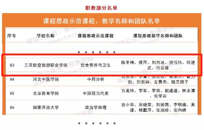 近日,教育部公布课程思政示范课程、教学名师和团队名单,我校“饮食营养与卫生”课程成功入选。同时,我校陈冬梅、侯萍、刘肖冰、樊伟伟、何进武、肖容雍等几位老师获评课程思政教学名师和团队。此次海南省高职院校仅3门课程入选此名单。