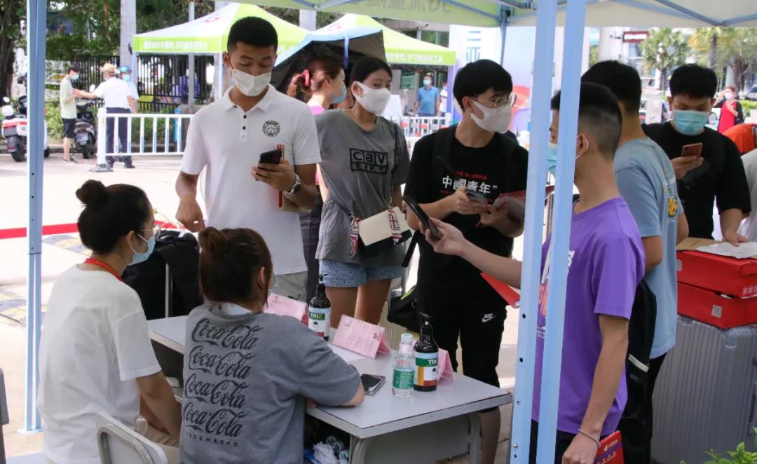 新生从学校西门统一通过防疫关口进入校园,家长和新生在校门口分别,同学们即将独立完成报到的全部过程,加油少年们!
