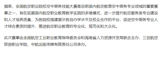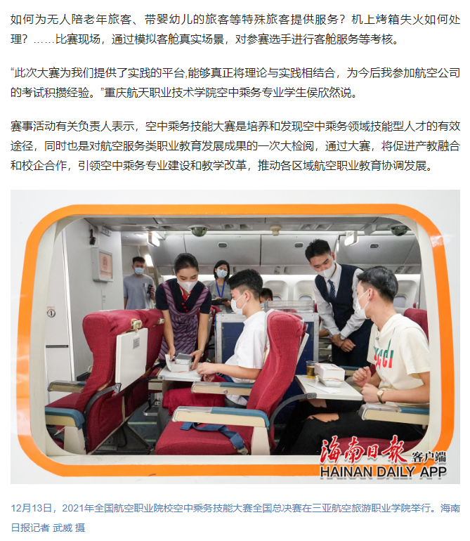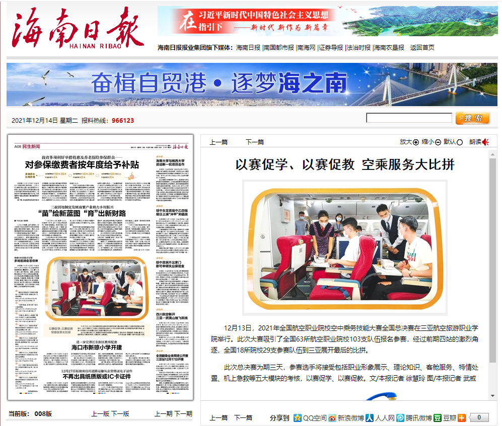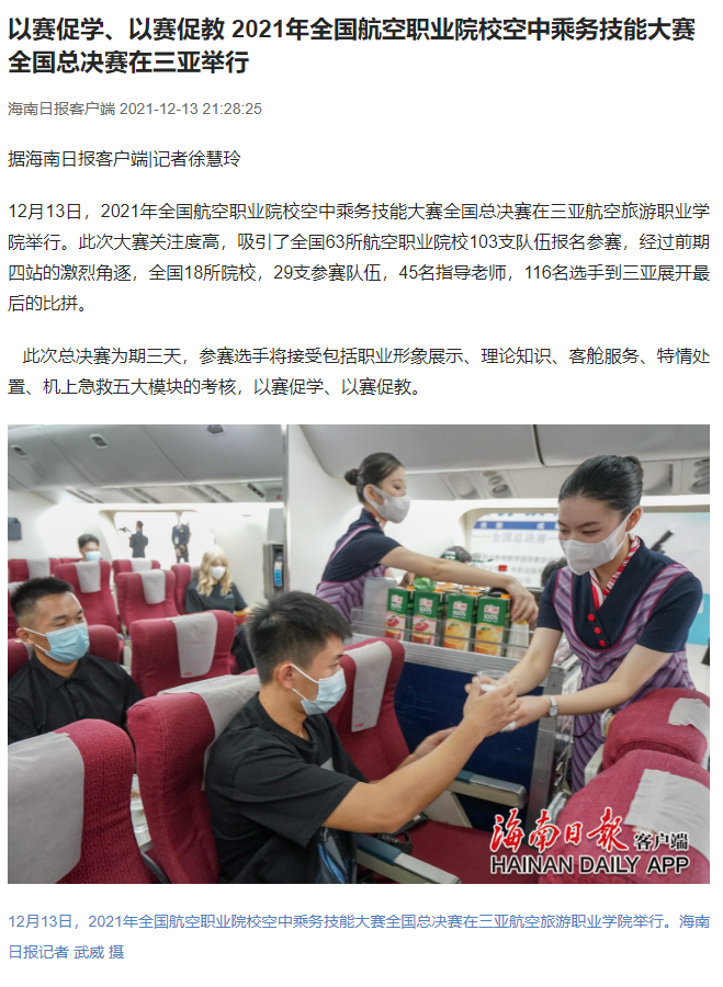 2021年12月13日《海南日报》报道《以赛促学、以赛促教2021年全国航空职业院校空中乘务技能大赛全国总决赛在三亚举行》
