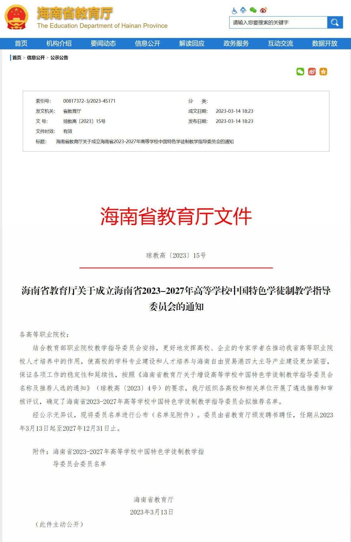 2023年3月13日,海南省教育厅下发文件《关于成立海南省2023—2027年高等学校中国特色学徒制教学指导委员会的通知》(琼教高〔2023〕15号),我校当选主任委员单位,我校党委书记、董事长兼校长杨涵涛任主任委员,国际旅游学院院长侯萍任秘书长。