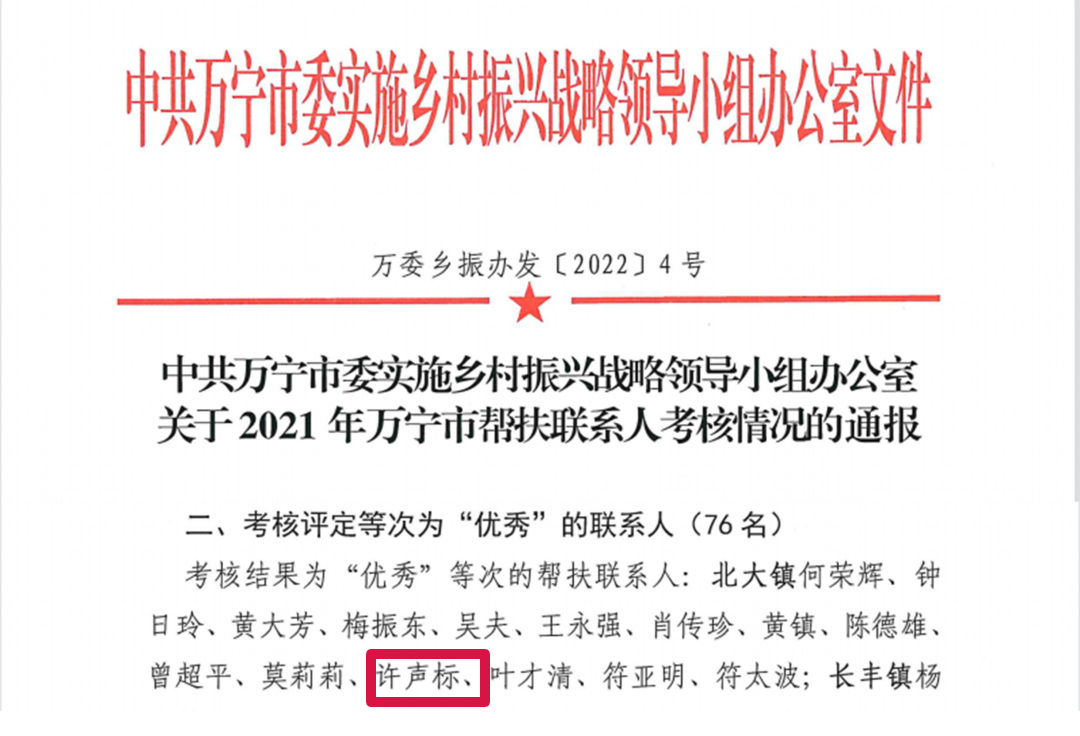 我校学生工作处业务主任许声标同志来到民丰村担任驻村第一书记,至今已有四个年头,并在2021年、2022年万宁市帮扶联系人考核中获评“优秀”。自驻村以来,许声标同志从未忘记“退役不褪色”的铮铮誓言,用实际行动诠释初心使命,脚踏实地带领群众谋发展、促振兴,为民丰村百姓的幸福生活奉献着自己的力量。