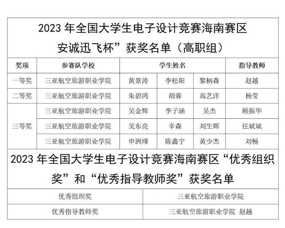 2023年全国大学生电子设计竞赛海南赛区“安诚讯飞杯”已顺利落下帷幕。我校共获得省赛一等奖1项,二等奖1项,三等奖3项,优秀指导教师1名,并荣获竞赛“优秀组织奖”,共计7项。本次竞赛共有省内10所院校的198支队伍594名学生报名参加,我校共组织14支队伍42名学生报名参赛。获奖数量在高职组中连续两年排名第一。