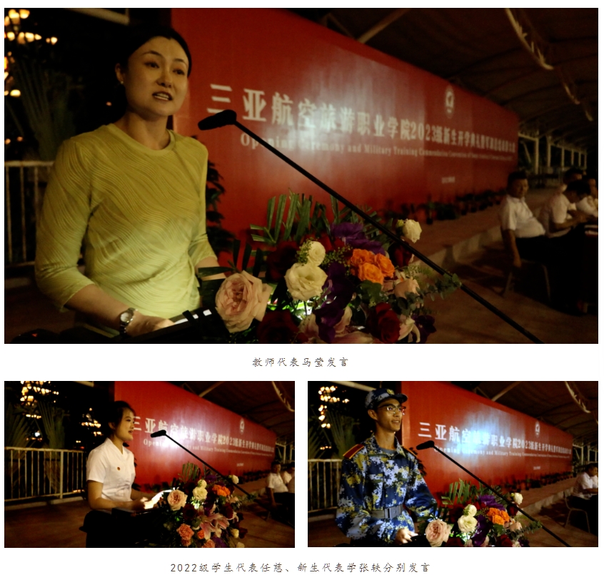 随后,教师代表马莹、2022级学生代表任慈、新生代表张轶分别发言,表达了对于新同学的欢迎和对校园学习生活的向往与期许。至此,三亚航院2023级新生开学典礼暨军训总结表彰大会顺利落下帷幕。