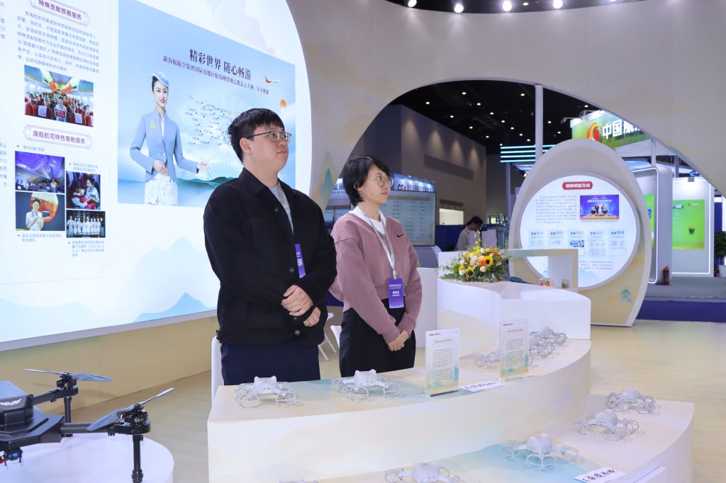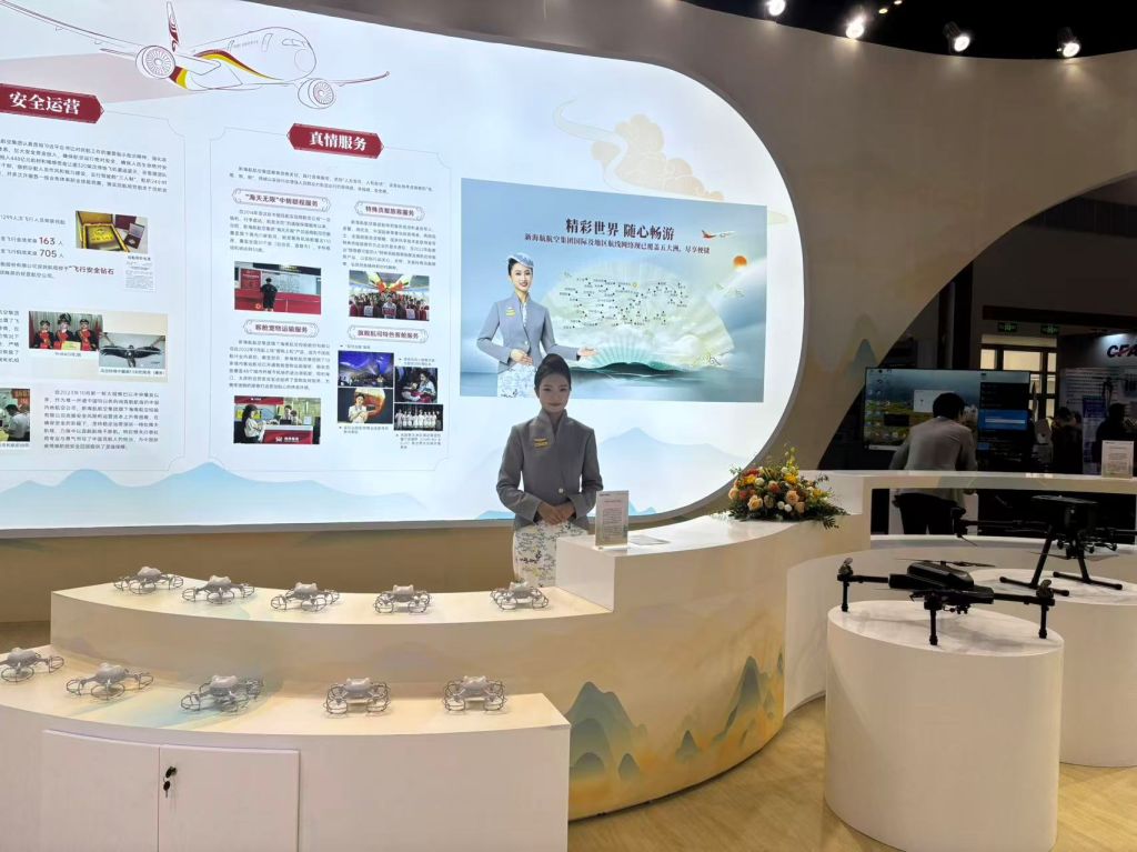 本次大会以“创新驱动航空业高质量发展”为主题,汇聚了国内外航空运输、航空制造、低空经济等领域的领军企业与院校。新海航航空集团展厅以“海上生明月,天涯共此时”为设计灵感,采用国风卷轴构型,生动诠释了“一翼深耕民航卓越成就,一翼振翅低空经济新蓝海”的“两翼齐飞”战略。三亚航院作为新海航航空集团的重要组成部分,在展区内重点呈现了无人机应用技术专业的人才培养成果、特色教学设备及校企合作案例。