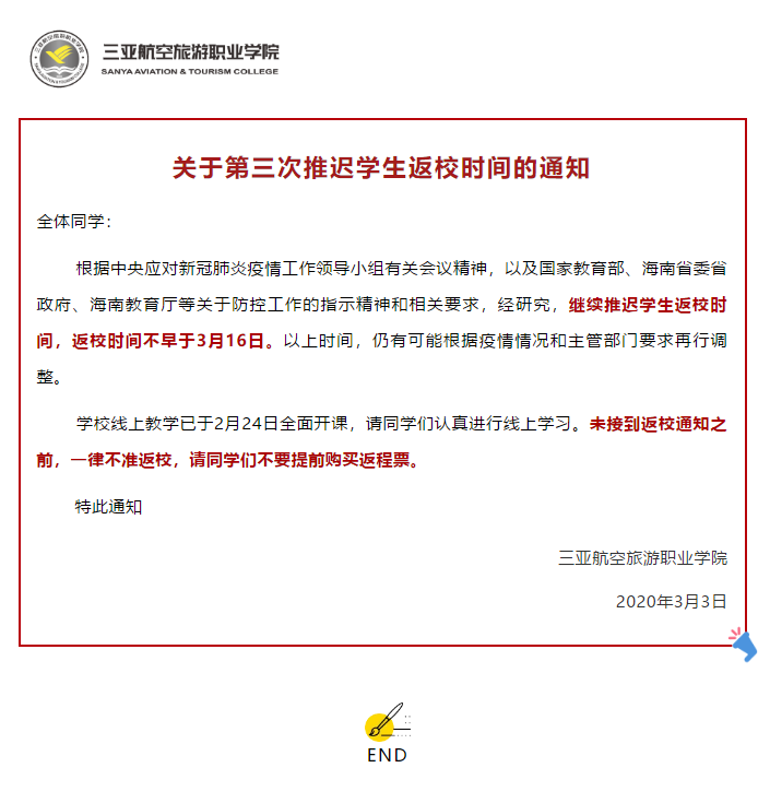 重要通知丨关于第三次推迟学生返校时间的通知