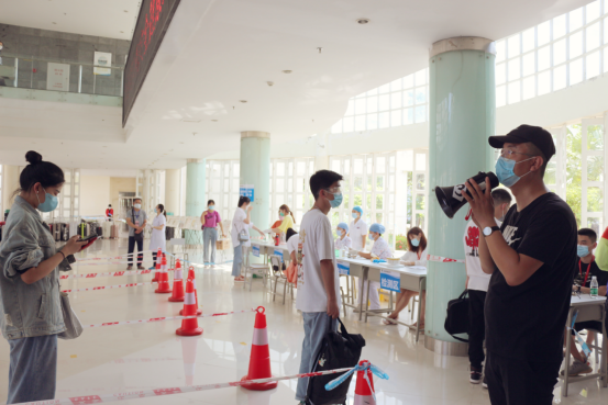 在学生正式返校的四天时间里,韩魁老师负责把控学生流量最大的第一关口,负责对学生进行行李消毒、体温检测、信息核检,并维持抗体检测与结果等待时的秩序。