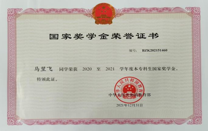 马翌飞是人文社科学院计算机网络技术2001班学生,在校期间担任班长及院学生会主席职务。成绩优异,表现突出。曾获得2020-2021年度国家奖学金,2021-2022年度国家励志奖学金,共青团中央、中国学联中国电信奖学金·飞young奖,同时他发挥自己专业优势,积极参加各项专业比赛,曾获得2021 年第三届全国高校计算机能力挑战赛”国赛二等奖等,提升自己能力的同时为学院和学校赢得荣誉。