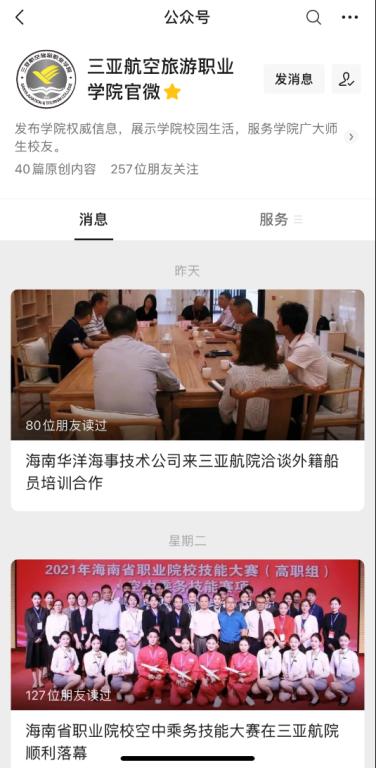 本年度,学校微信公众号发布信息147条,在向社会公众宣传学校办学教育成果的同时,也同步公开办学治校等方面的重要信息,如我校荣获全国职业院校技能大赛飞机发动机拆装与调试赛项二等奖、教师入选教育部继续教育课程思政教学名师、教学团队、获批教育部继续教育课程思政项目、荣获2021年海南省高等职业教育技能大赛教学能力比赛一等奖等。